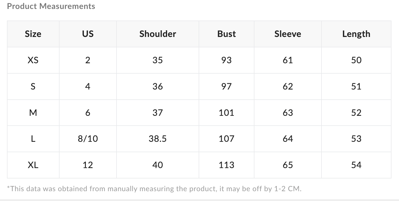 | Size | US | Shoulder | Bust | Sleeve | Length |